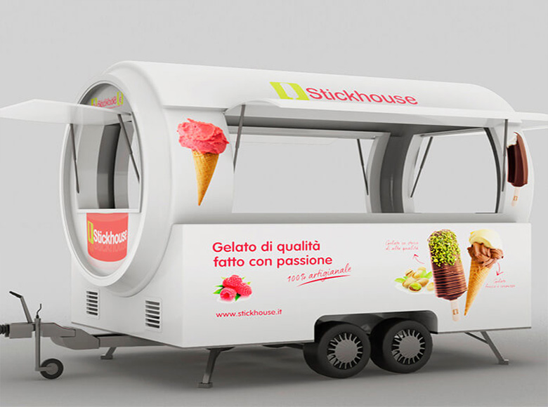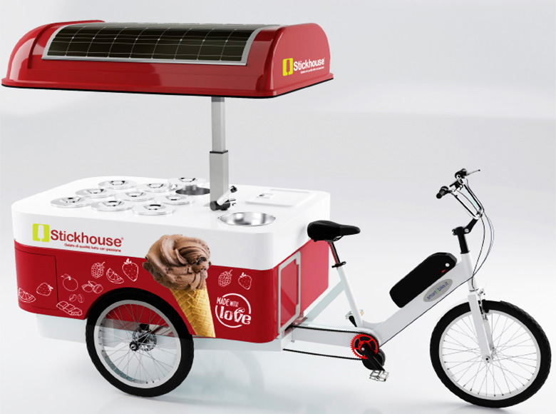 A selection of mobile units suitable for the sale of ice cream on sticks or equipped for SCOOP ice cream with production and sale on site.